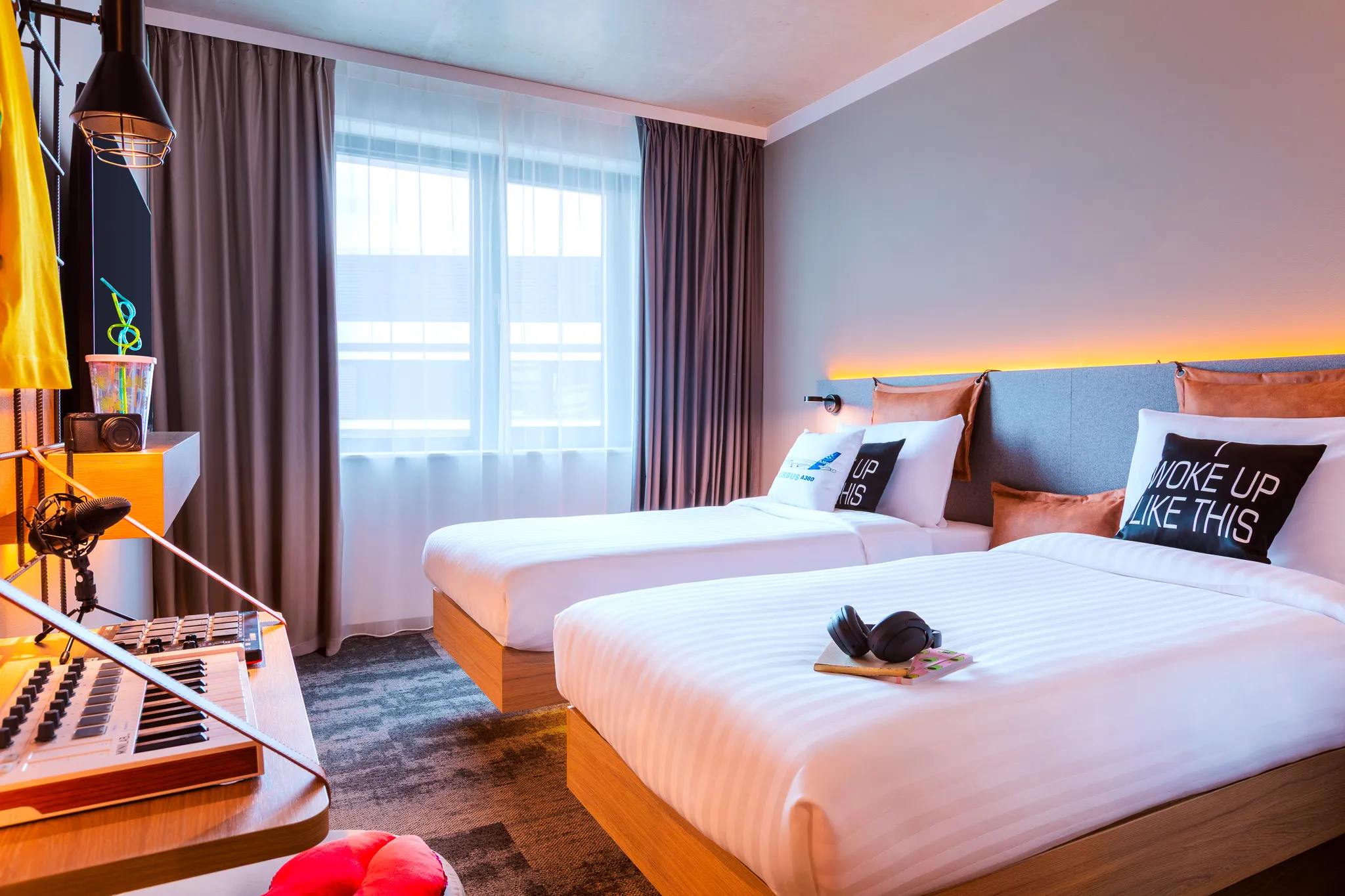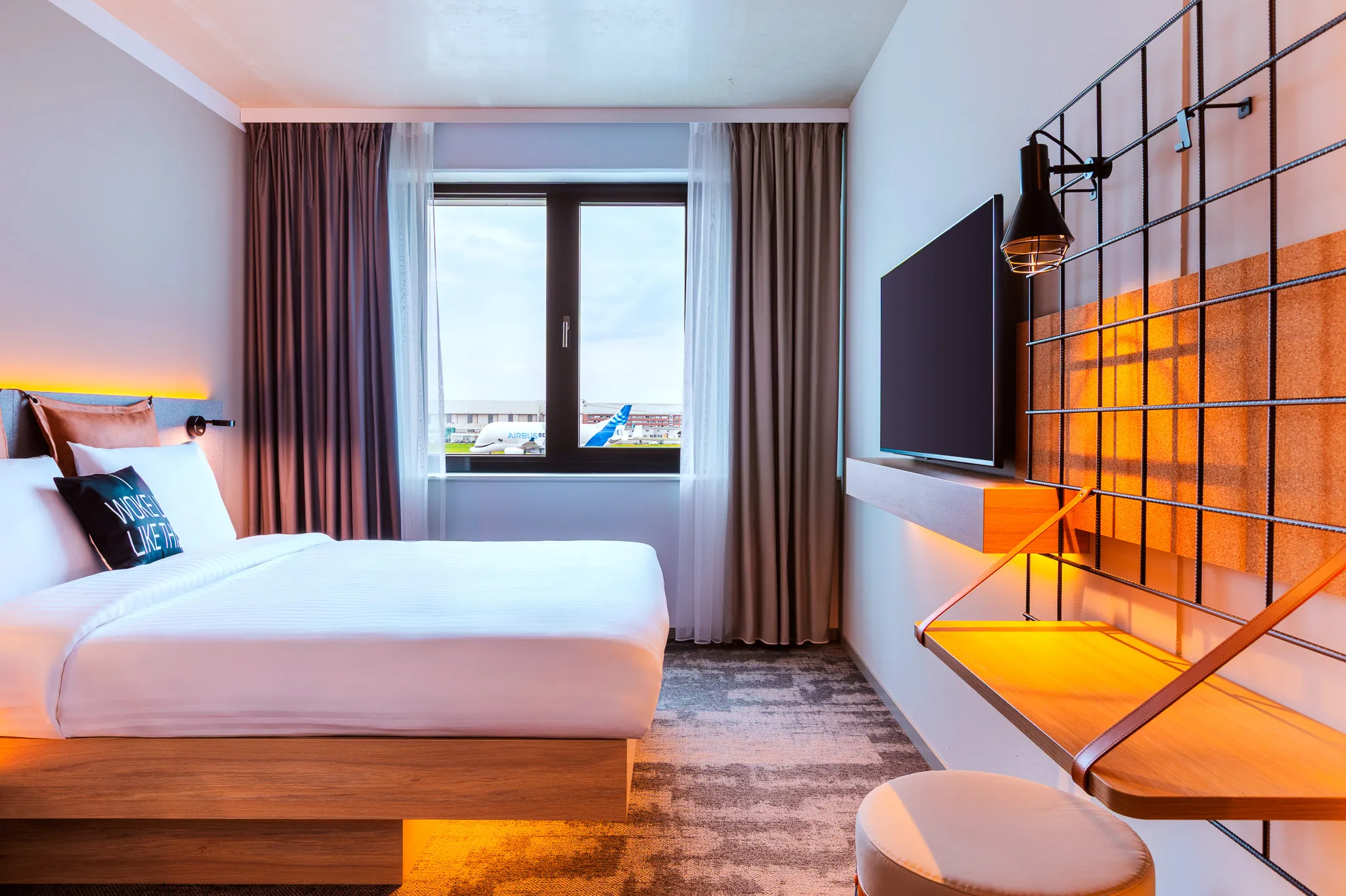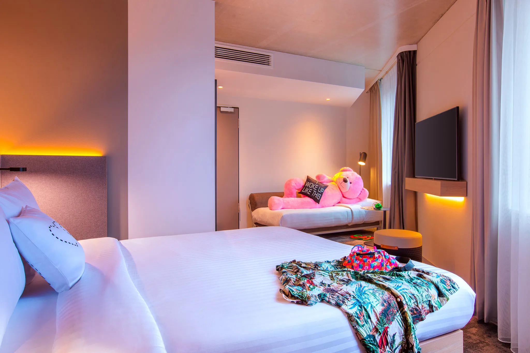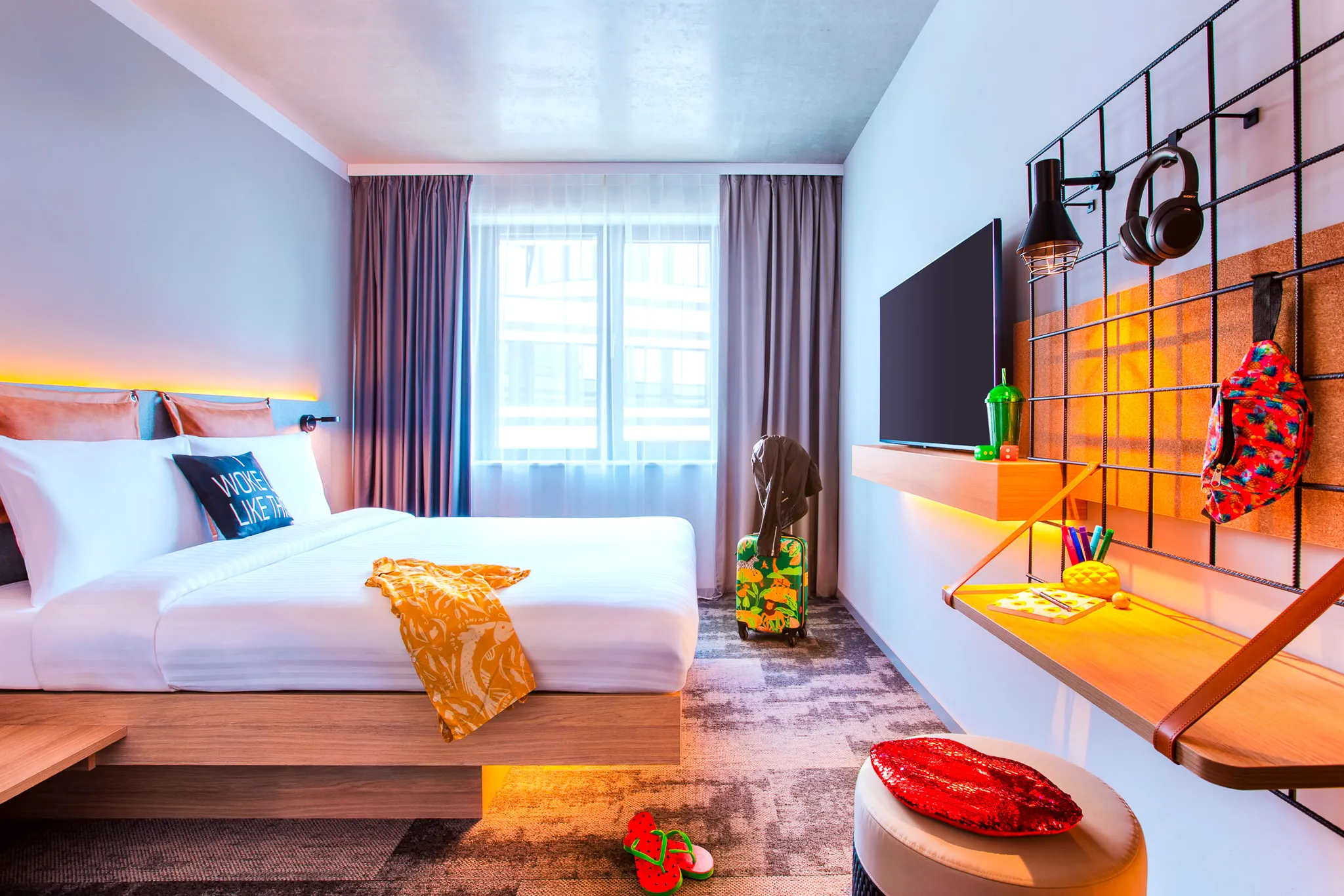Sleep tight in style! Our chic, cleverly designed, and #Instagrammable rooms have everything you need to unwind—comfy bedding, bath amenities, and a sleek, functional layout. Stream, scroll, or kick back with free high-speed Wi-Fi, a premium sound system, and a 42-inch flat screen. With motion-activated LED lighting, bold art walls, and a cozy leather lounge chair, every stay is effortlessly cool.